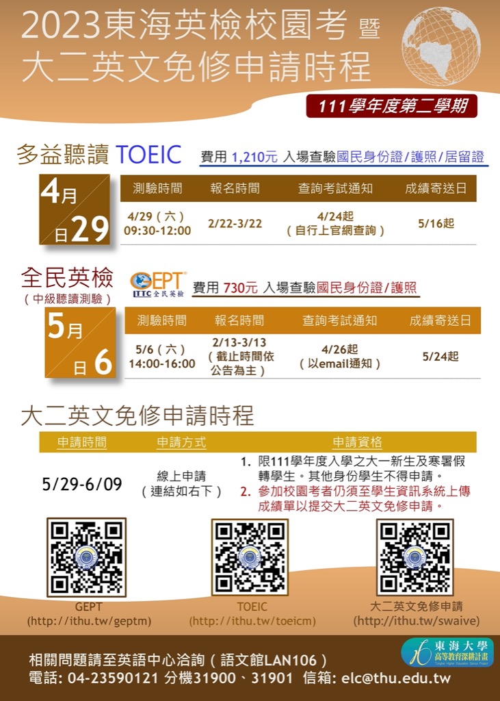 - 多益聽讀校園考:2023 年 4 月 29 日(星期六)09:30-12:00(報名時間:2/22-