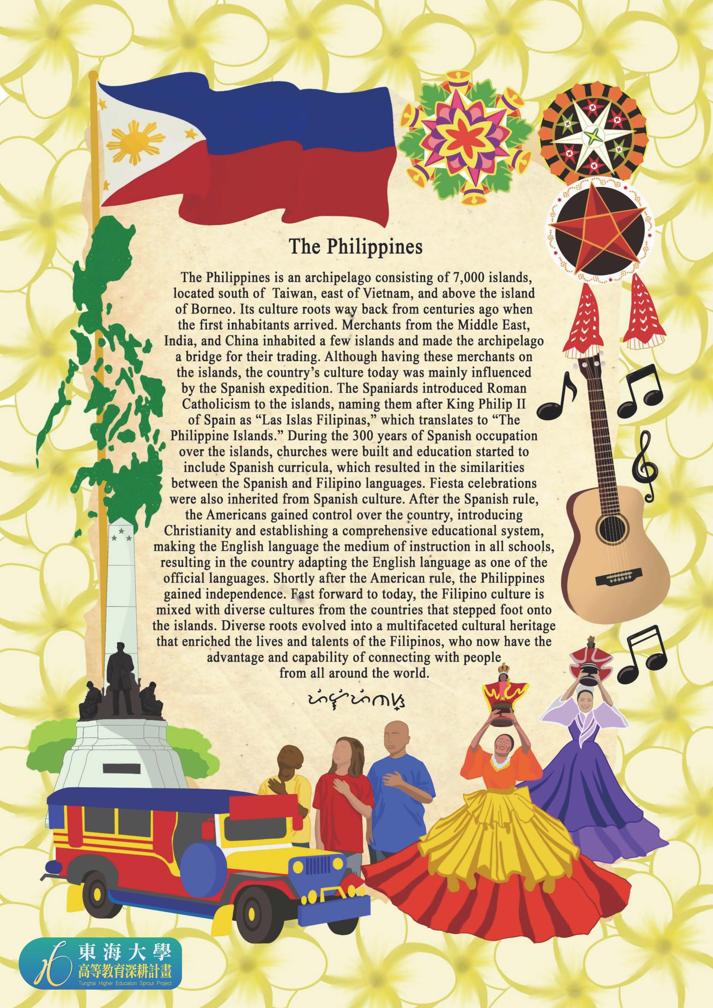 The Philippines prides itself on solidarity and resilience. (Looking from the top left) The country’s flag colours symbolize peace, justice, and truth which applies to all the 7000 islands. During the Spanish control over the country in 1896, Filipino nationalists have fought for the country’s independence, resulting in the Spanish-American war. The Philippines’ local transportation as it is known today, called the "jeepney", was created during the war for independence, which was used to transport troops. When the Philippines gained independence, freedom and merriness flooded the country. The people will never forget that historical period that formed their country into what it is today. Although being free from the Spaniards, the people still held on to what they have been doing under the influence of the Spaniards. Fiestas were held to commemorate special events such as religious events and many more. As it is known in many parts of the world, Filipinos pride themselves in being the powerhouse of voices. Singing to their heart’s content with joy and happiness. The star-shaped symbols are called "Parols" which is hanged in every corner when it comes to the Christmas season, as, Filipinos put very much value on family gatherings. The little symbols at the end of the paragraph in the poster, which translates to "The Philippines", are the original writings of the Filipinos in the precolonial period, called "Baybayin". |