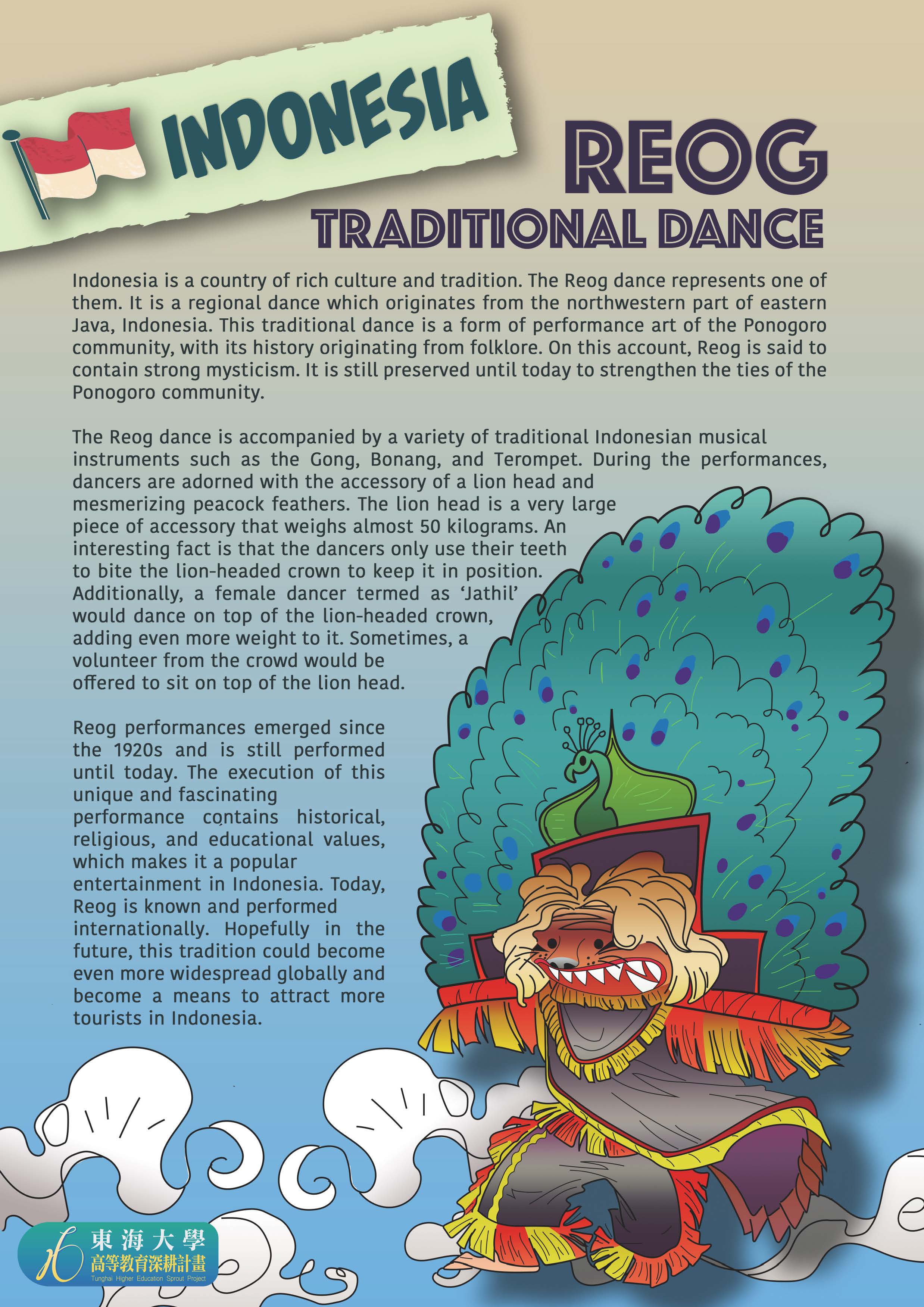 "Indonesia is a country of rich culture and tradition. The Reog dance represents one of them. It is a regional dance which originates from the northwestern part of eastern Java, Indonesia. This traditional dance is a form of performance art of the Ponogoro community, with its history originating from folklore. On this account, Reog is said to contain strong mysticism. It is still preserved until today to strengthen the ties of the Ponogoro community. The Reog dance is accompanied by a variety of traditional Indonesian musical instruments such as the Gong, Bonang, and Terompet. During the performances, dancers are adorned with the accessory of a lion head and mesmerizing peacock feathers. The lion head is a very large piece of accessory that weighs almost 50 kilograms. An