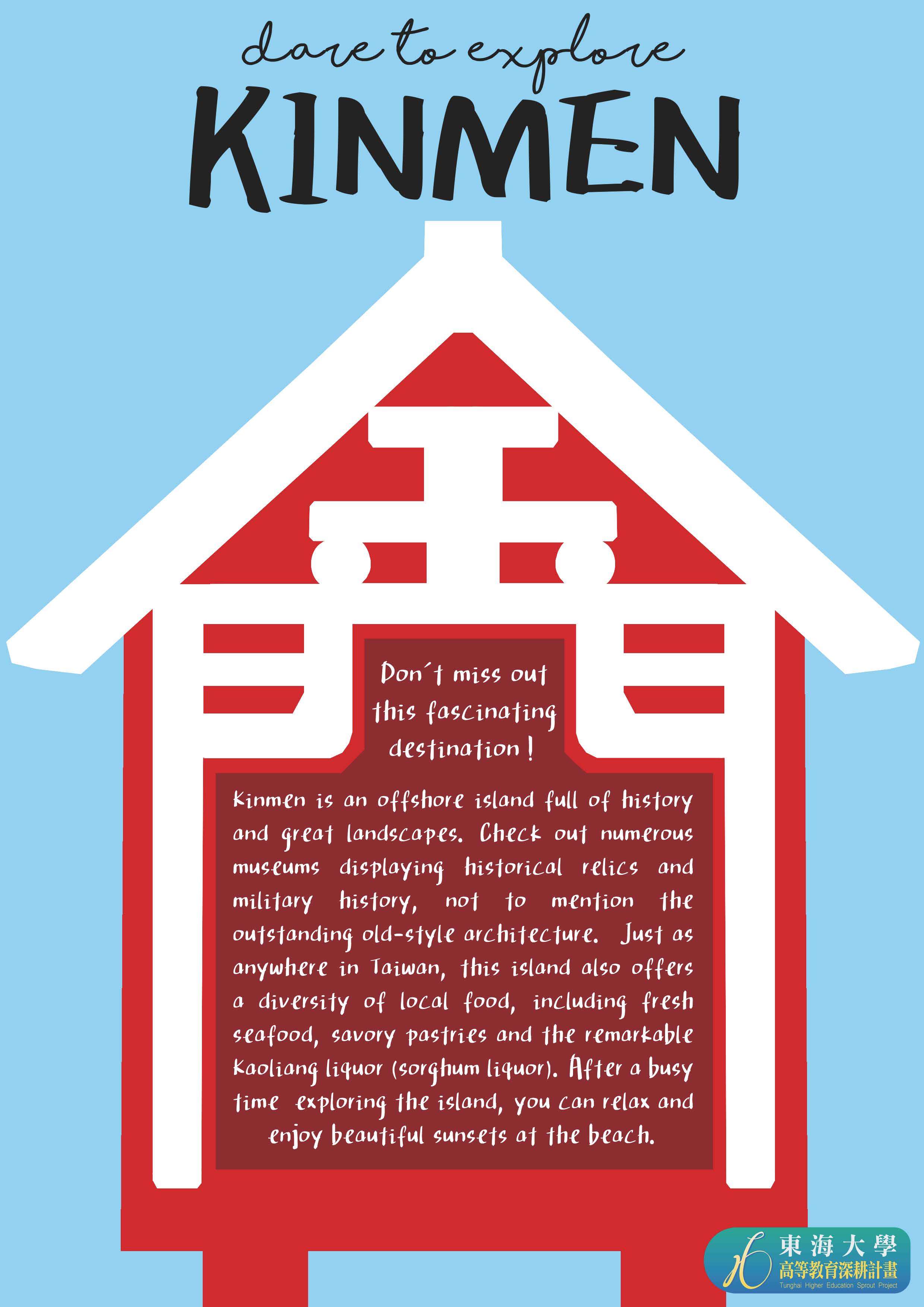 Since I was a kid, I have been going to Kinmen almost every year to visit my mother. Every time I return, I just can not avoid noticing all the statues, old buildings, and the natural landscape. Although many people may think there is not much to do in Kinmen, which might be true depending on each person’s interest, I believe it is not only about what you can find; instead, we should ask ourselves: "How can I enjoy this at the maximum?". Many places might seem boring without any exciting activity to do, but we can just look inside our heads and come up with something! Nowadays, sometimes we can be overwhelmed by urban life and how fast everything passes by. I think Kinmen is one of the places where we can just get away from all the city noise and relax. The concept of this poster represents the environment on this island: simple. I also chose to use the old-style telephone booth because it is really something unique about the island and it has an ingenious design; you can find this kind of booths all around the island. It is good for the mind and the body to get exposed to nature once in a while. Kinmen not only offers that, but is also full of valuable history about the island and Taiwany, making it a must-visit destination. |