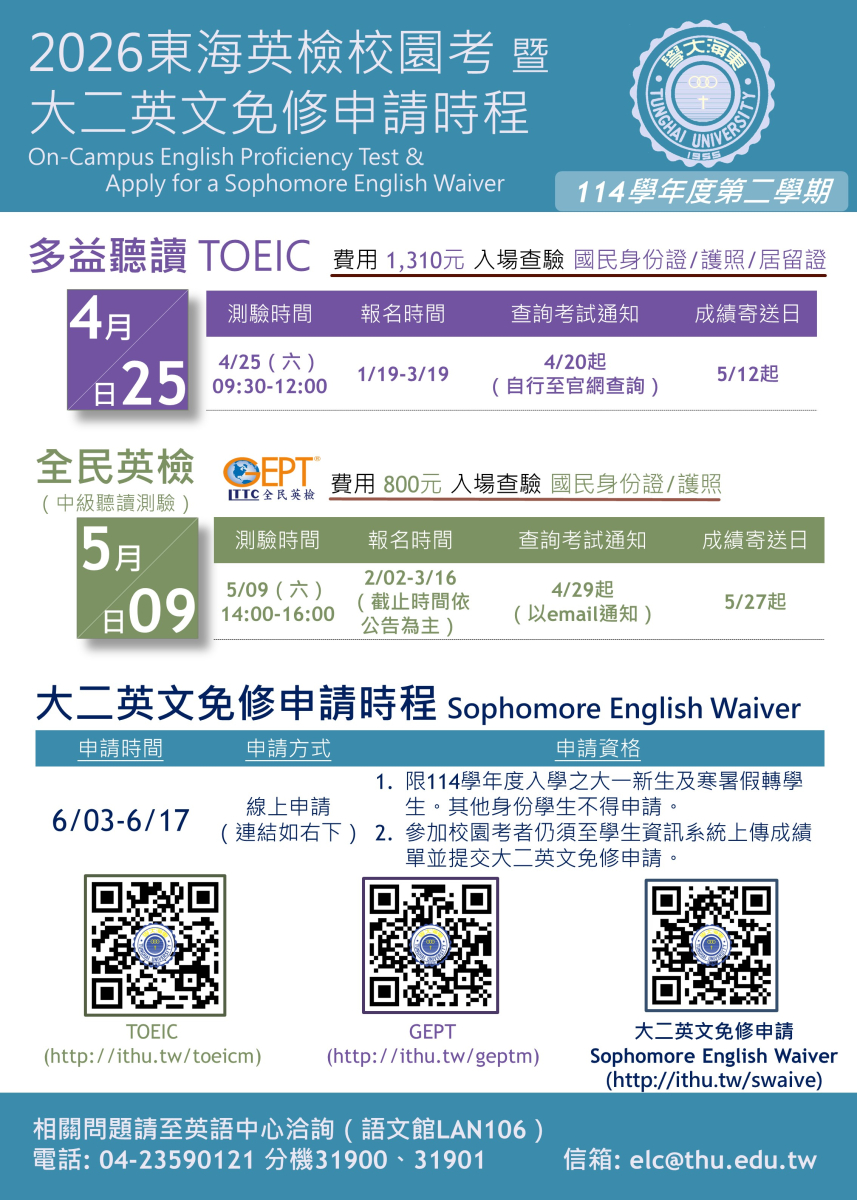 - 多益聽讀校園考:2026 年 4 月 25 日(星期六)09:30-12:00(報名時間:1/19-3/19)